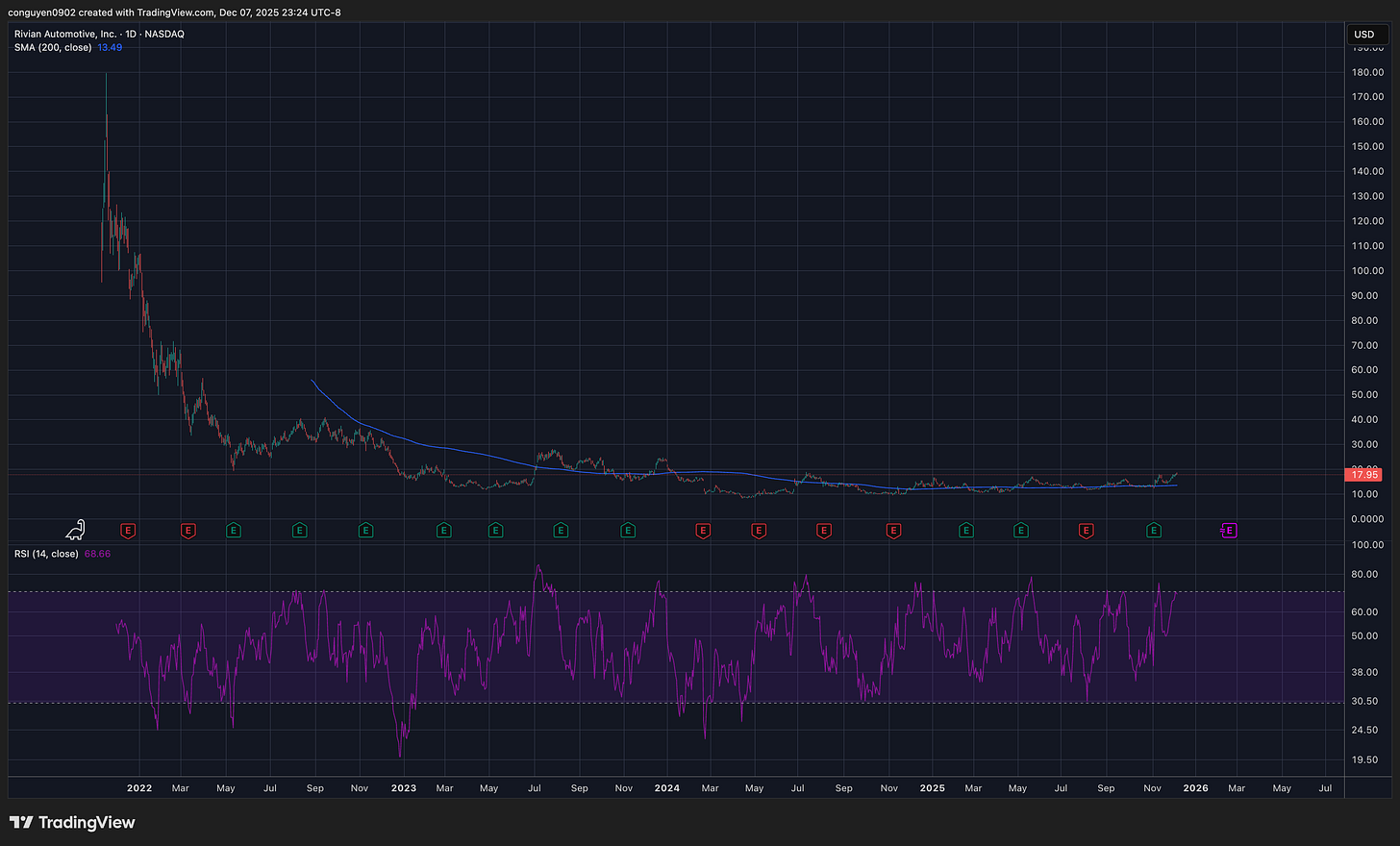 If you zoom out on Rivian, you see a massive spike after the IPO, a brutal collapse when the EV bubble popped, and almost two years of sideways movement at the bottom. It looks dead, which is usually where the real turn begins.